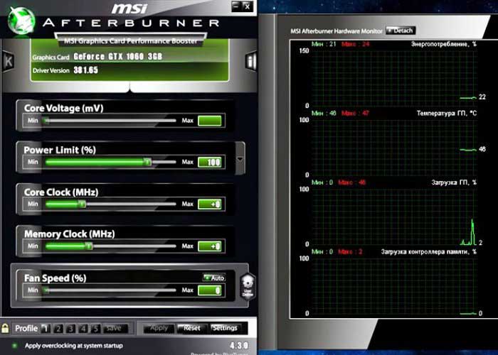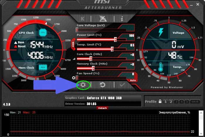 Программа AfterBurner не предоставляет возможность редактирования точки ниже, чем на 800 мв. Приемлемое соотношение расположено выше. Данное условие не мешает. Наилучшая скорость — семьсот слов на сто девяносто ватт.