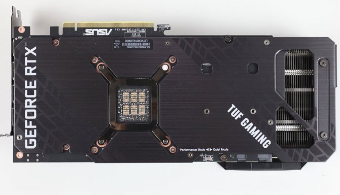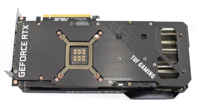Что касается задней панели, то это полноразмерный бэкплейт, также сделанный из алюминия. ASUS добавила два выреза на конце карты, чтобы воздух мог проходить прямо через радиатор, а также сделала вырез на месте GPU.