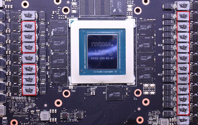 Чипы памяти GDDR6X производятся компанией Micron и имеют номер модели «D8BGW», который декодируется как «MT61K256M32JE-19: T». Они предназначены для работы на частоте 1188 MHz (эффективная частота GDDR6X — 19 Gbps).