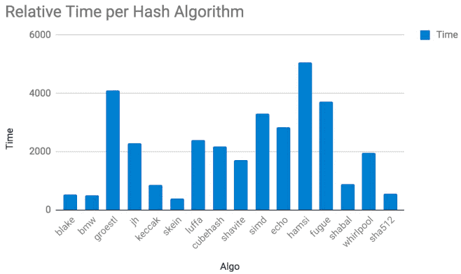 Каждая шестнадцатеричная цифра (полубайт) определяет, какой алгоритм использовать дальше. cubehash -> shabal -> echo -> blake -> blake -> simd -> bmw -> simd -> hamsi -> shavite -> whirlpool -> shavite -> luffa -> groestl -> shavite -> cubehash