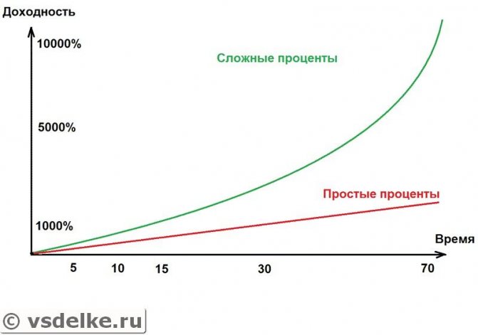 Чтобы инвестировать и называться инвестором необязательно иметь большие деньги. Большинство будут иметь небольшие счета в районе 1 млн рублей. Но даже с таким счётом можно достичь существенной прибыли за 10-20 лет благодаря реинвестированию процентов. За счёт этого получается эффект сложных процентов. Этот принцип иллюстрирует следующий график:
