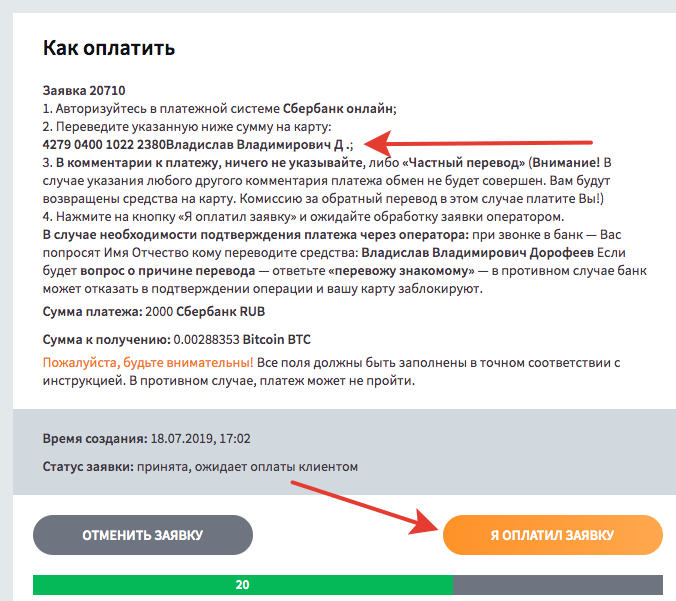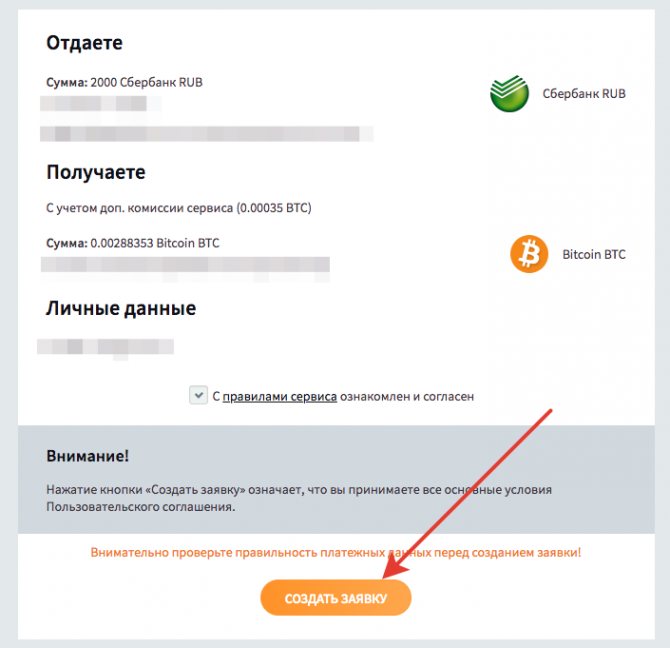 - Создание заявки. В ней надо указать данные карты Сбербанка, с которой будет отправлен перевод, сведения о биткоин кошельке для зачисления криптовалюты, а также сумму для обмена. Все данные надо проверять внимательно.