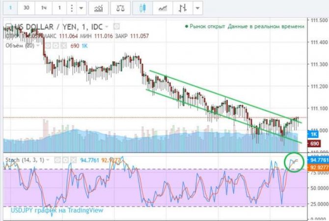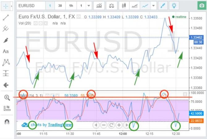 Дополнить стратегию можно использованием индикатора Стохастик, который на экране отображается в нижней части ценового графика и позволяет уточнить правдивость сигнала. В дополнение к картине по линиям сопротивления/поддержки нужно обращать внимание и на показания Стохастика. Если кривые индикатора пробили уровень 80 сверху вниз, то следует покупать Put-опцион (сигнал на рисунке изображен красными кругами и стрелками), если же они после пребывания «на дне» обратно пробили уровень 20, то нужно открывать сделку на повышение (сигнал на рисунке изображен зелеными кругами и стрелками).