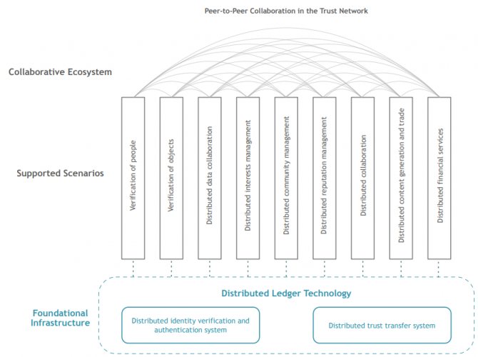 Основная цель проекта — создание экосистемы доверия путем партнерства для предоставления распределенных услуг, которые включают проверку и обмен данными и многое другое в разных отраслях. Система может применяться практически во всех секторах, включая IoT («интернет-вещи»), финансы, страхование, СМИ, разработку программного обеспечения, платежи, медицину и прочее.